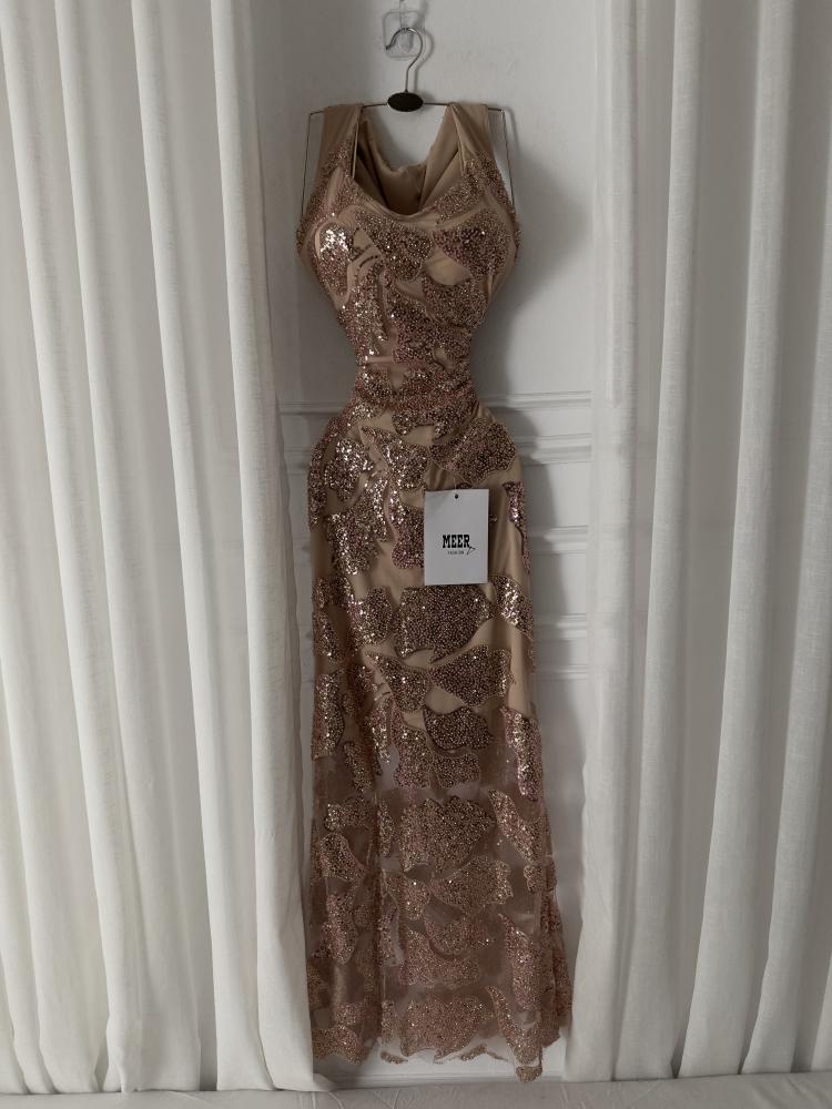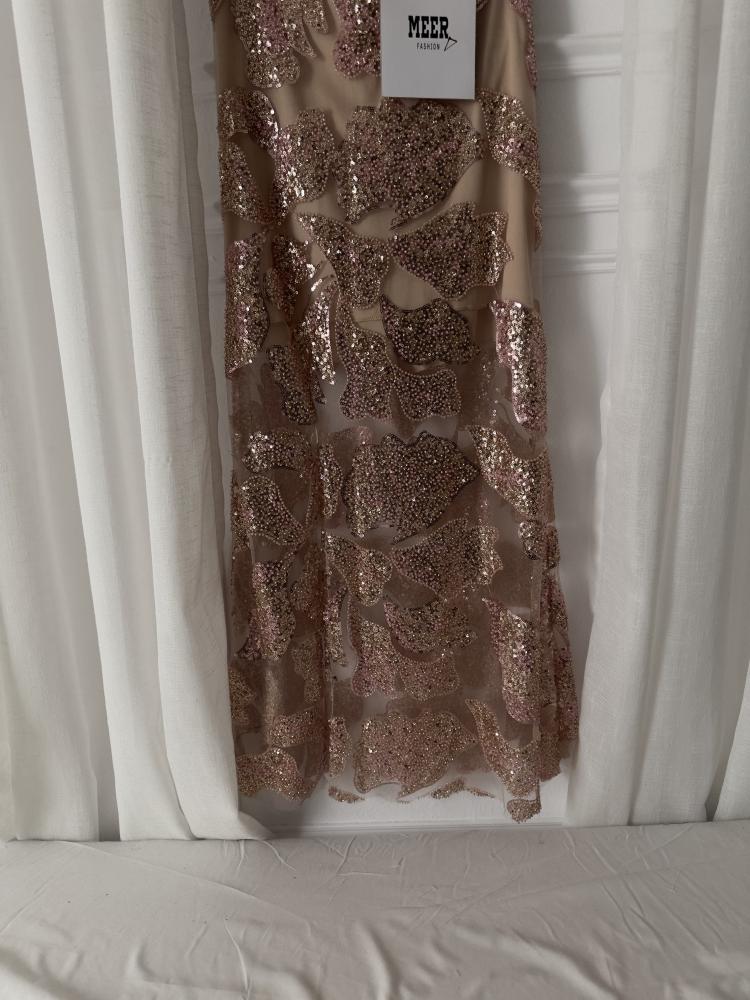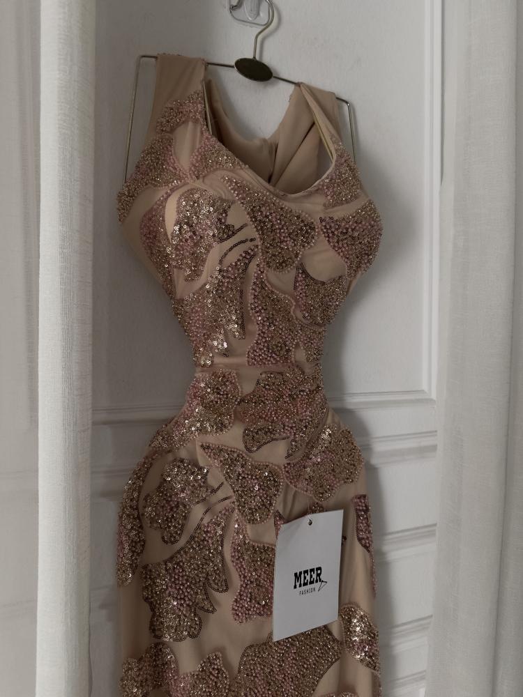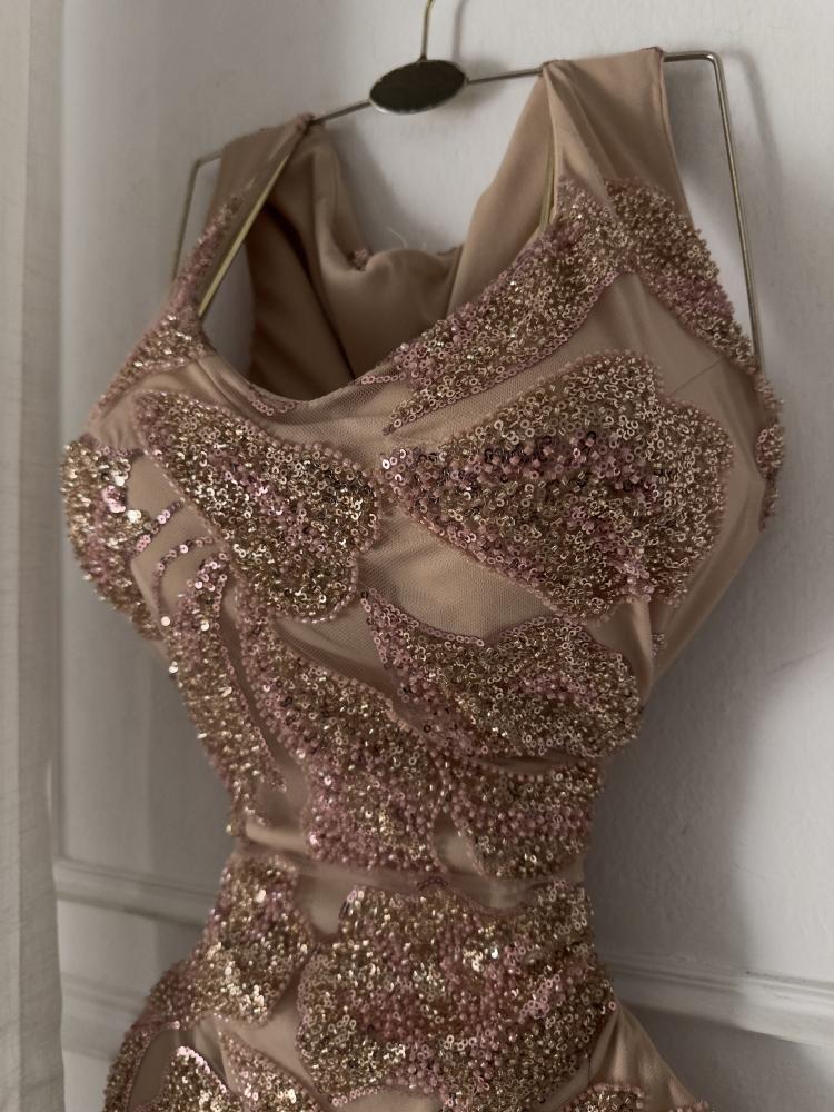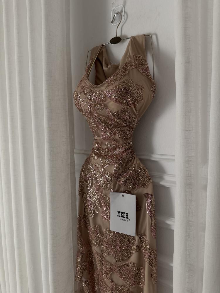 فستان سهرة بلون بيج وردي لامع بتطريز فخم من الترتر الوردي الذهبي بتصميم ضيق يبرز القوام وأنوثة الإطلالة. يتميز بفتحة صدر ناعمة وقماش شفاف متداخل يضفي لمسة راقية.