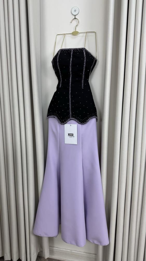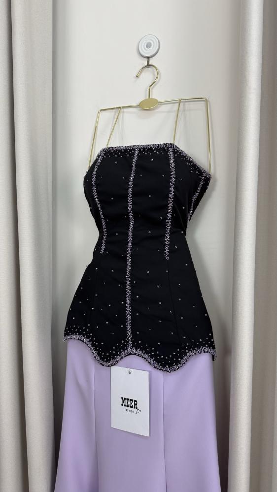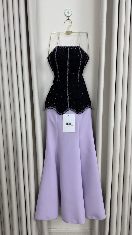 فستان سهرة أنيق بتصميم مكون من جزأين، كورسيه أسود مرصع بحبيبات لامعة وتطريز دقيق، وتنورة بنفسجية فاتحة بقصة واسعة تمنحه لمسة راقية وعصرية