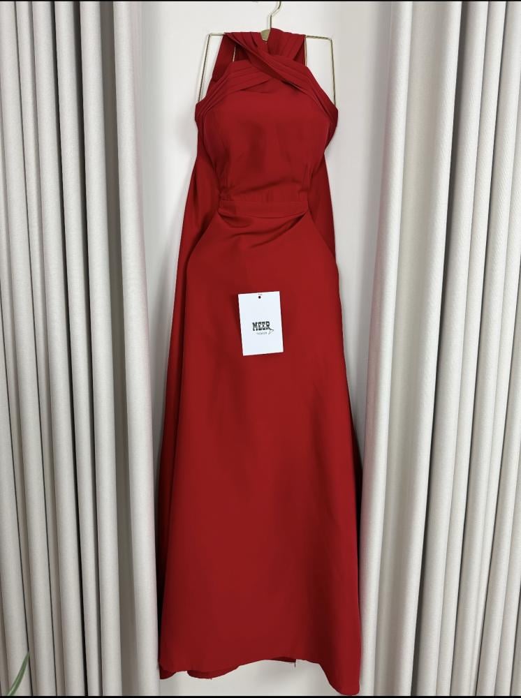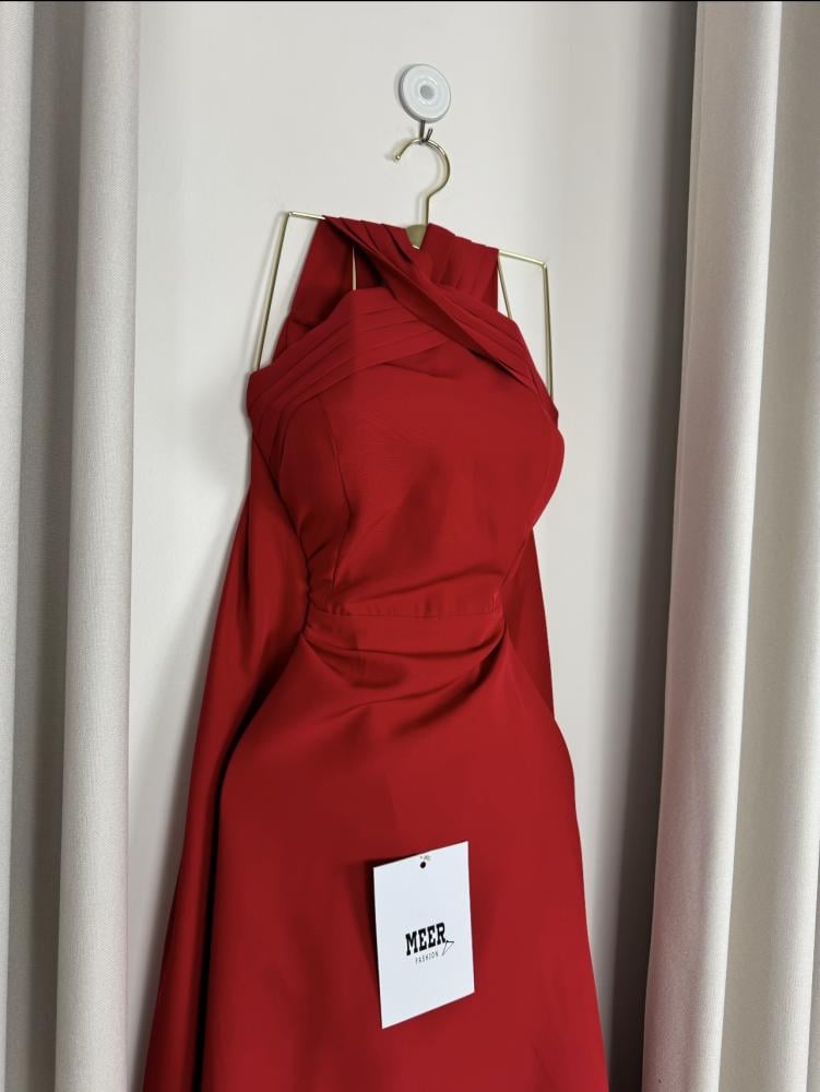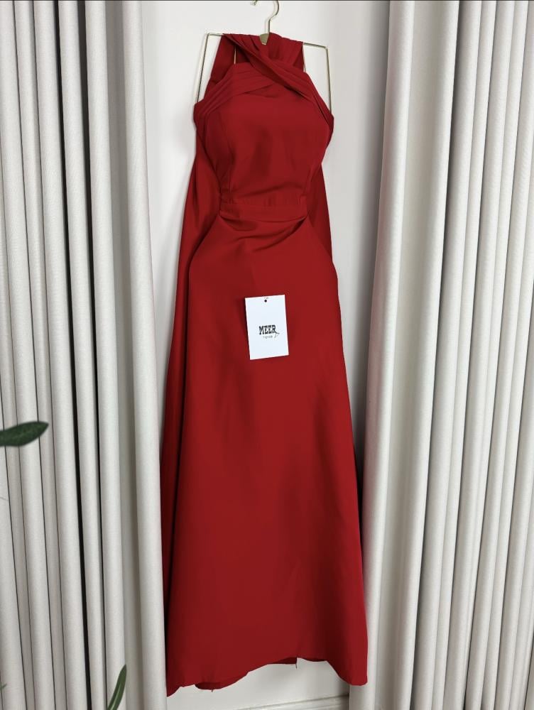 فستان سهرة أنيق باللون الأحمر، يتميز بتصميم صدر متقاطع من الأعلى وقصة انسيابية تضفي لمسة راقية وأنثوية مثالية للمناسبات الخاصة