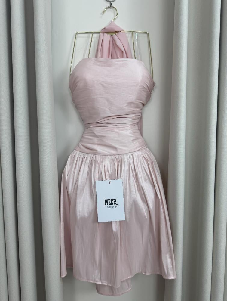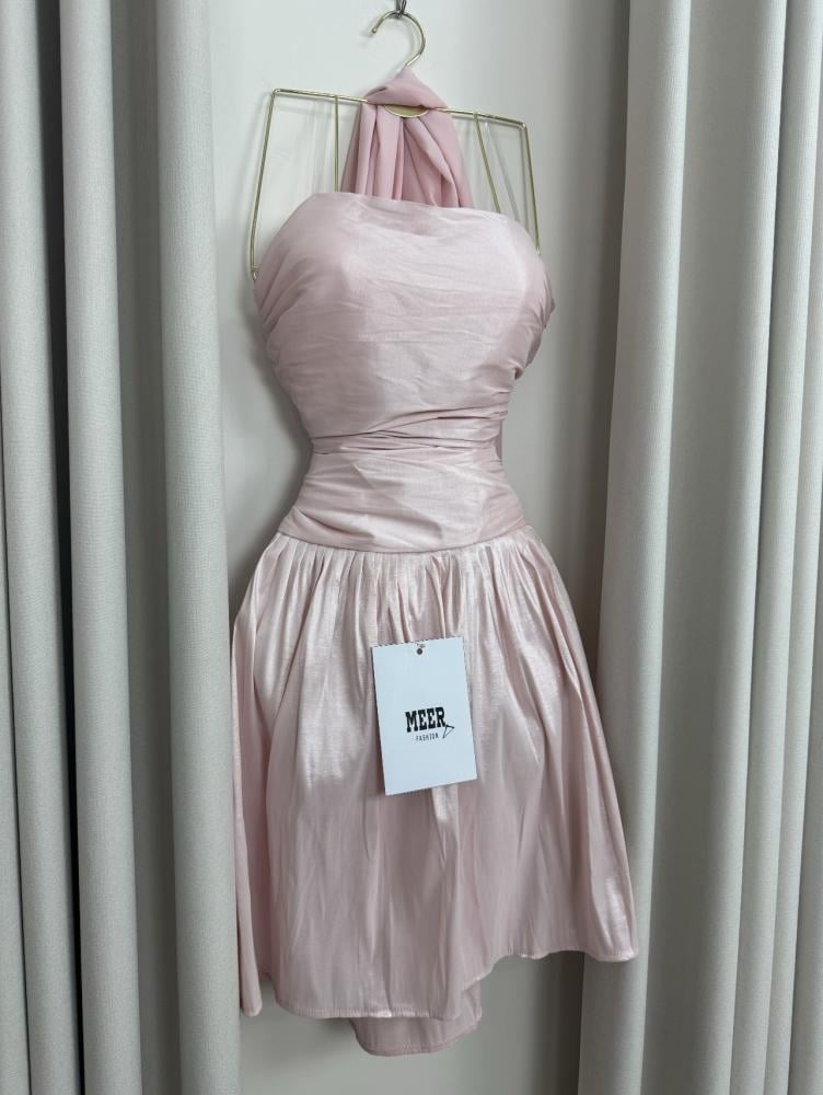 فستان قصير بلون وردي ناعم، بتصميم عصري بحمالة رقبة تلتف حول العنق، وخصر مشدود يبرز القوام، وتنورة منفوشة بخفة تمنحه لمسة أنثوية أنيقة