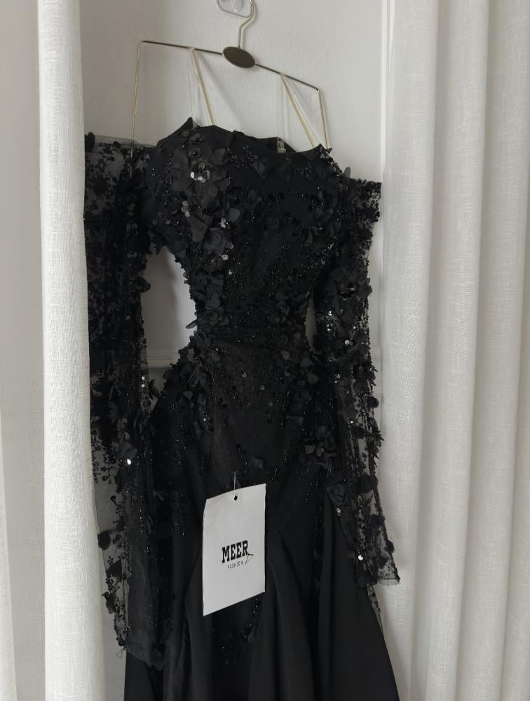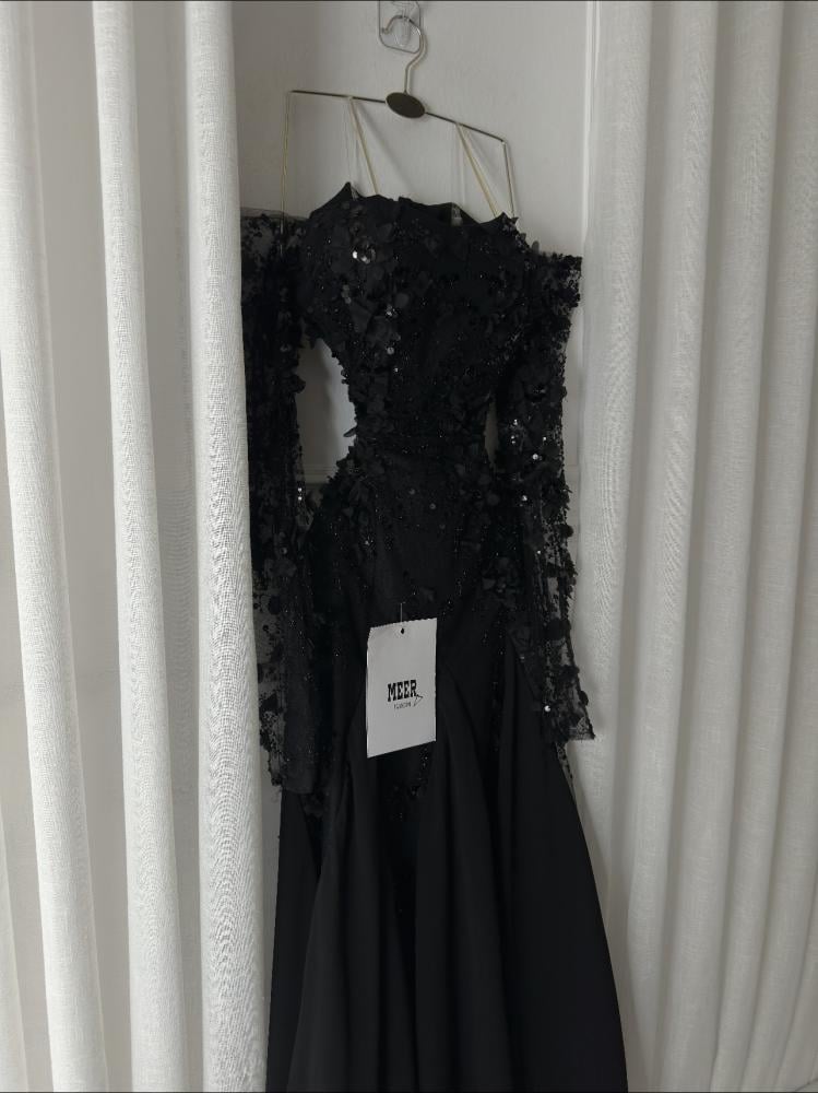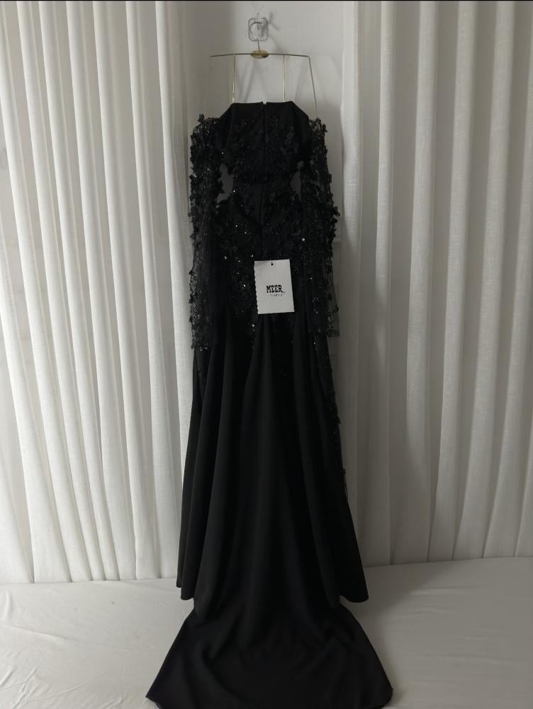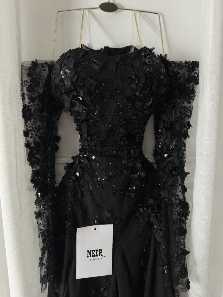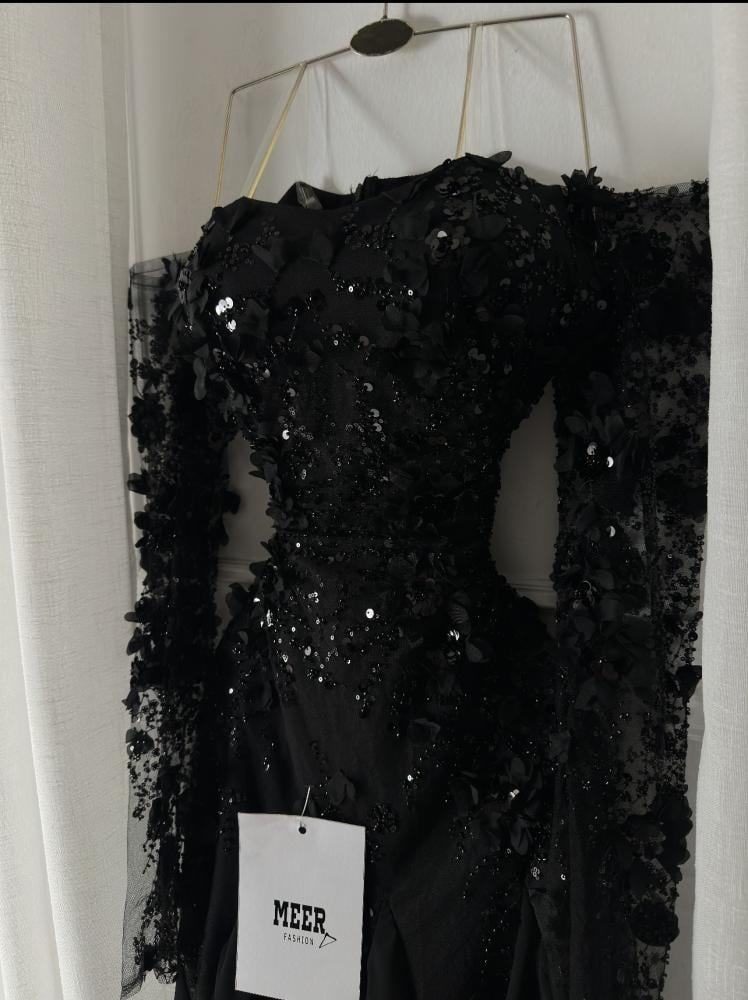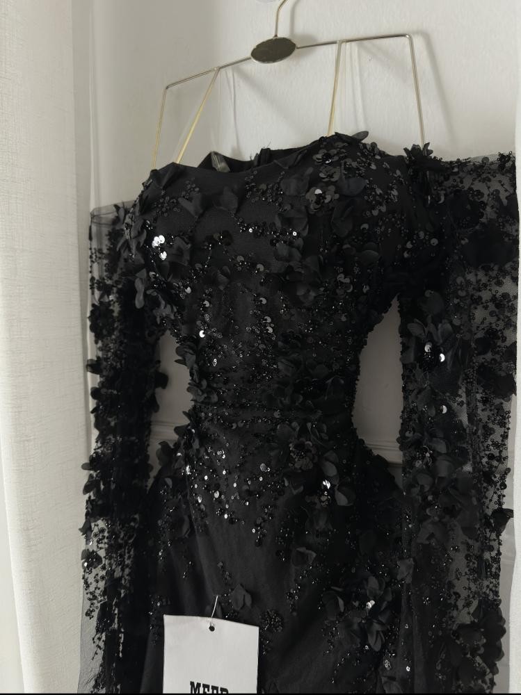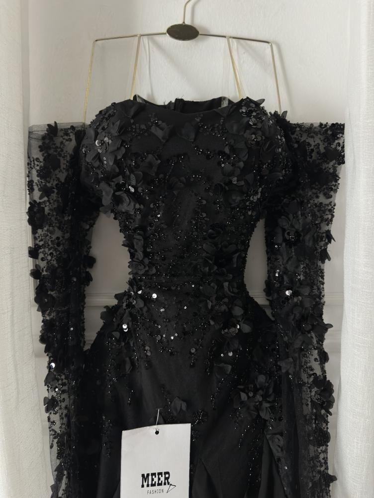 فستان سهرة أسود أنيق بتصميم ضيق من الأعلى مع تطريزات فاخرة من الخرز والترتر على الصدر والأكمام، يمتد بقماش ناعم من الأسفل بانسيابية جذابة لإطلالة فخمة وساحرة