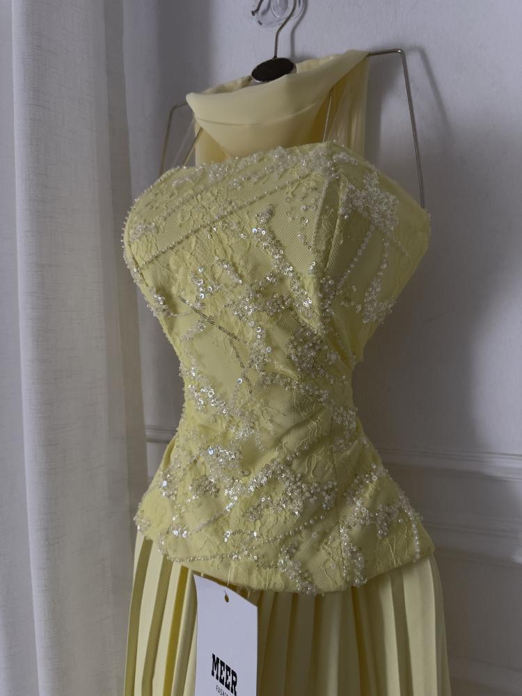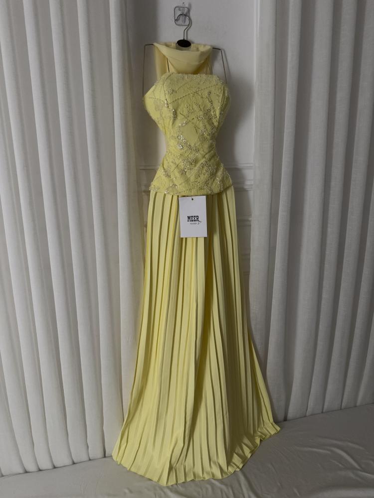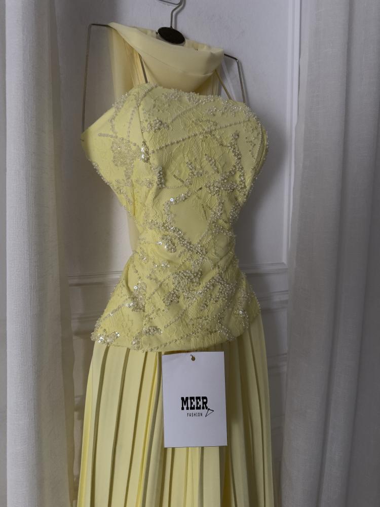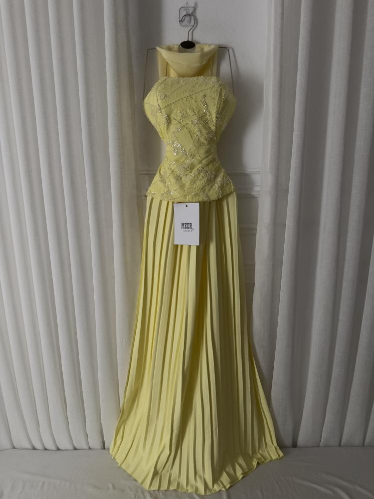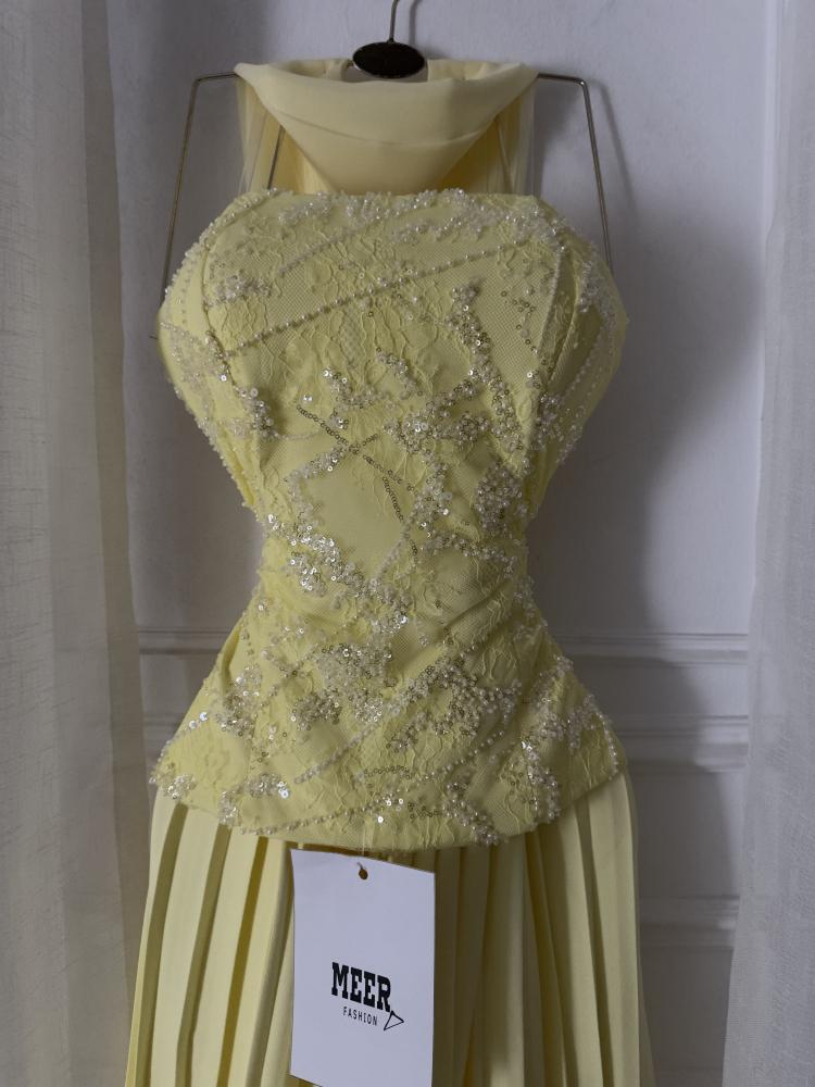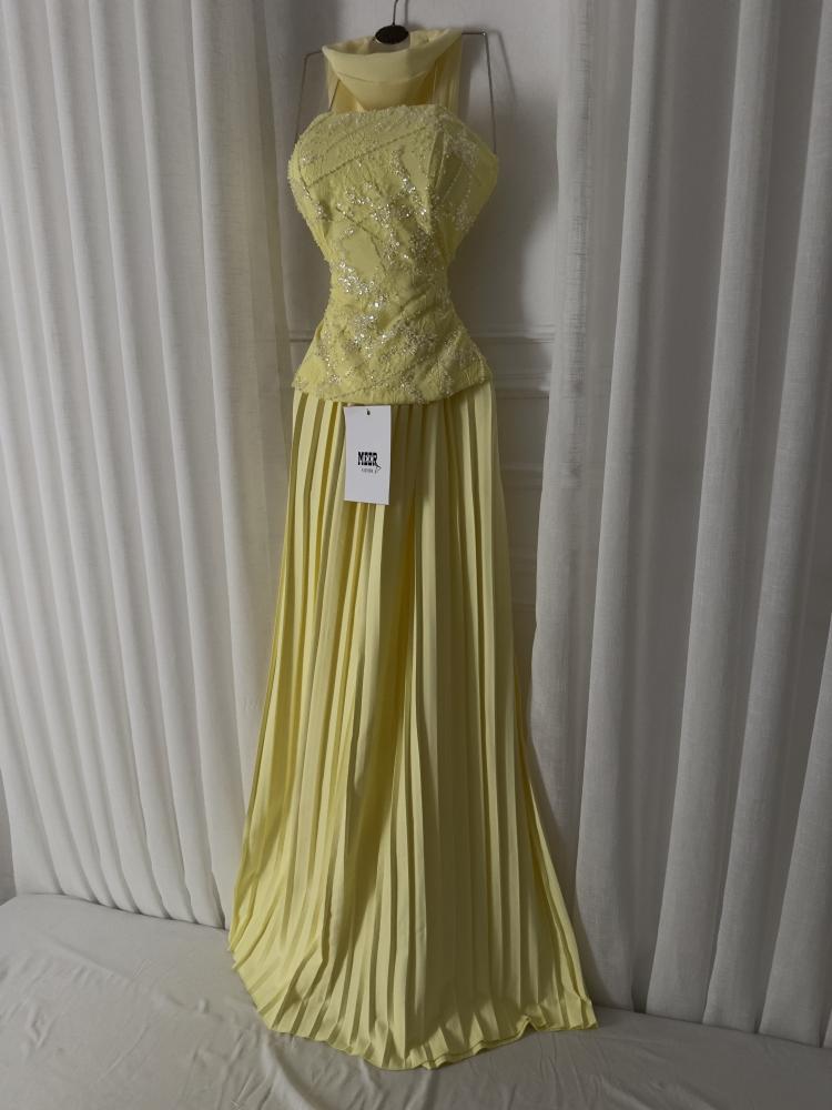 فستان سهرة أنيق باللون الأصفر الفاتح، يتميز بتصميم صدّارته المطرزة بالخرز اللامع بتفاصيل ناعمة، مع ياقة مرتفعة تضيف لمسة فخمة. تنورته طويلة بطيات انسيابية تمنحه مظهرًا راقيًا وأنثويًا مثاليًا للمناسبات الخاصة
