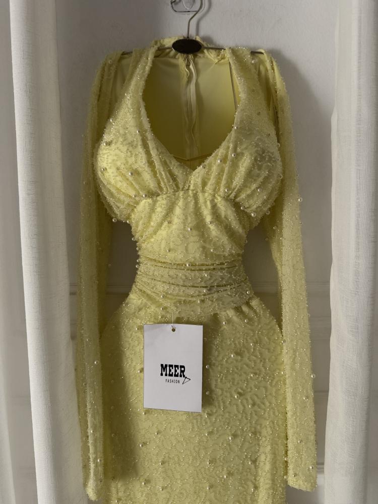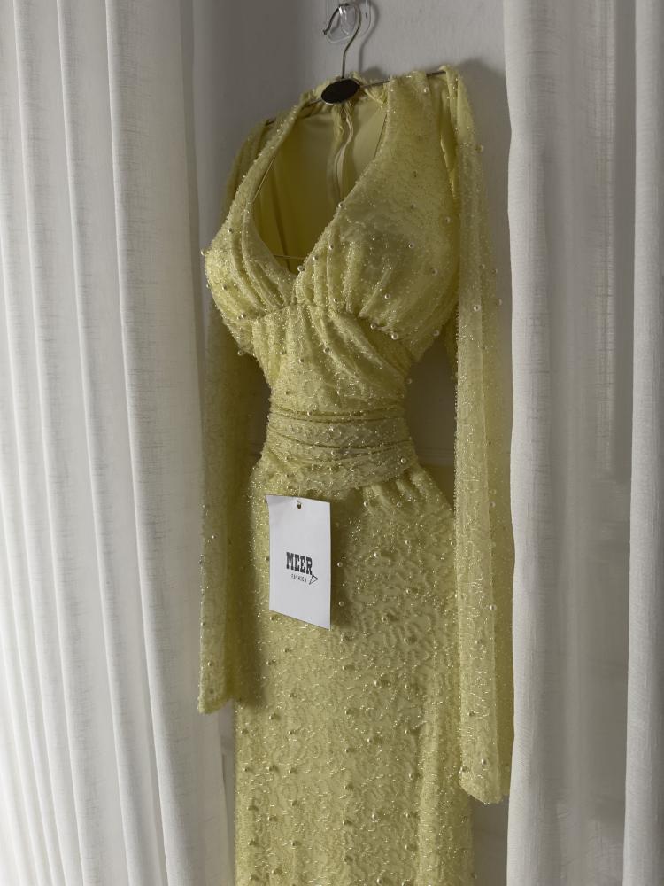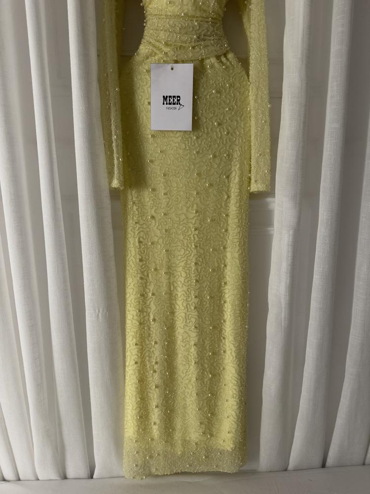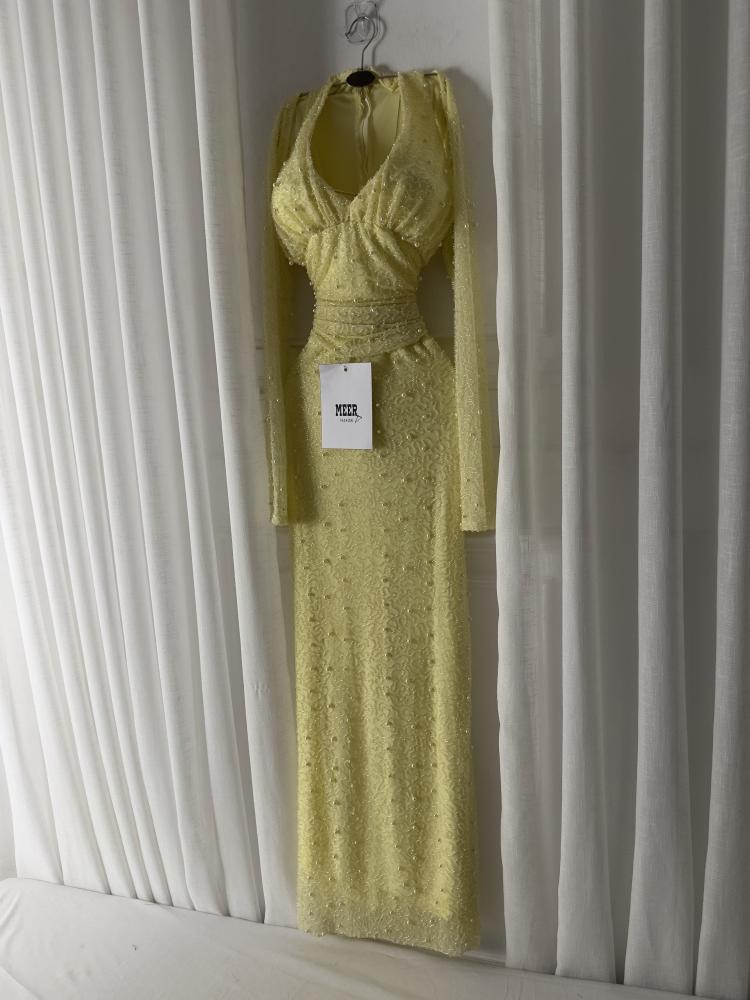 فستان سهرة أصفر فاتح بتصميم ضيق طويل، مزين بتطريزات لامعة وخرز ناعم، يتميز بقَصّة صدر ملفتة وأكمام طويلة شفافة تضيف لمسة أنثوية راقية