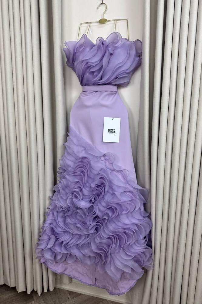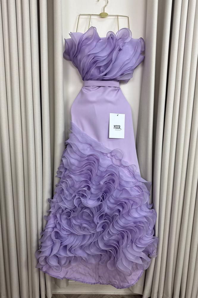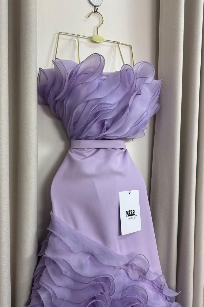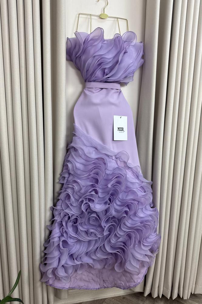فستان سهرة بنفسجي فاتح بتصميم ناعم وأنيق، يتميز بقماش شيفون مطوي بطبقات مموجة عند الصدر وأسفل الفستان، يمنحه مظهرًا فخمًا وأنثويًا. قصته ضيقة من الخصر لتبرز القوام بانسيابية وجاذبية