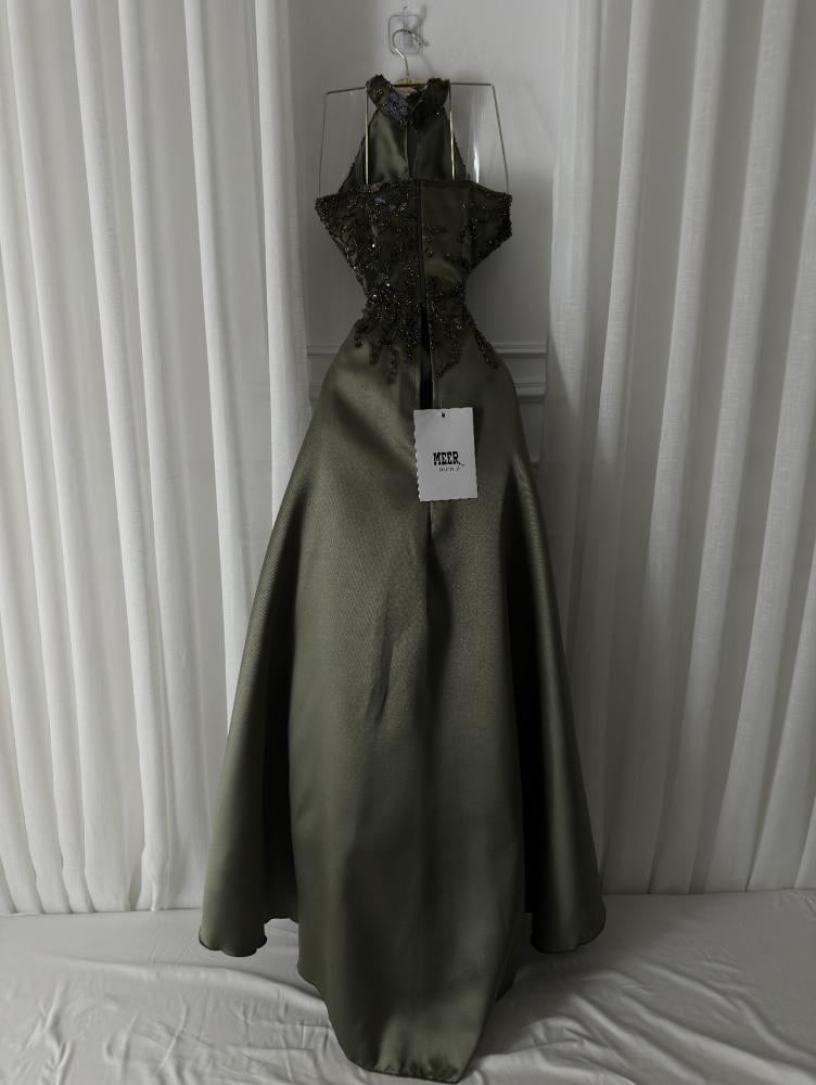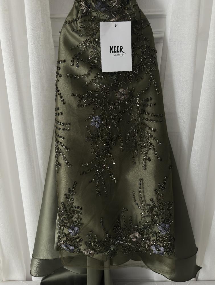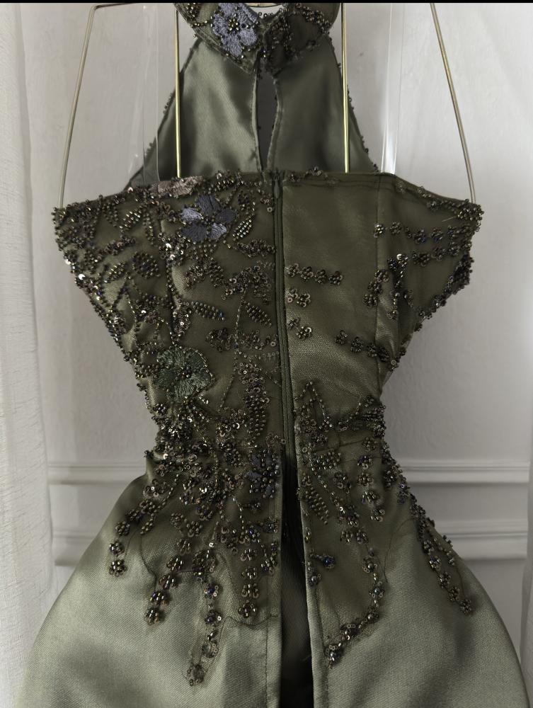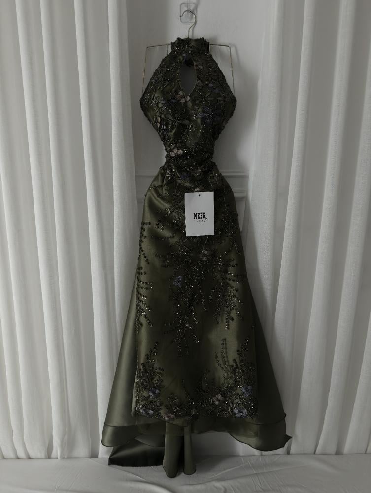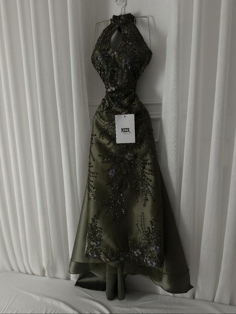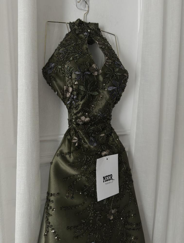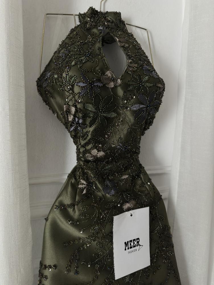 فستان سهرة أنيق باللون الزيتي الغامق، بتصميم رقبة عالية مفتوحة من الأمام وتطريز يدوي فاخر بالخيوط والترتر اللامع مع لمسات من الزهور البنفسجية. مصنوع من قماش ساتان ناعم بطبقة تول شفافة تضيف فخامة. مثالي للمناسبات والسهرات الرسمية
