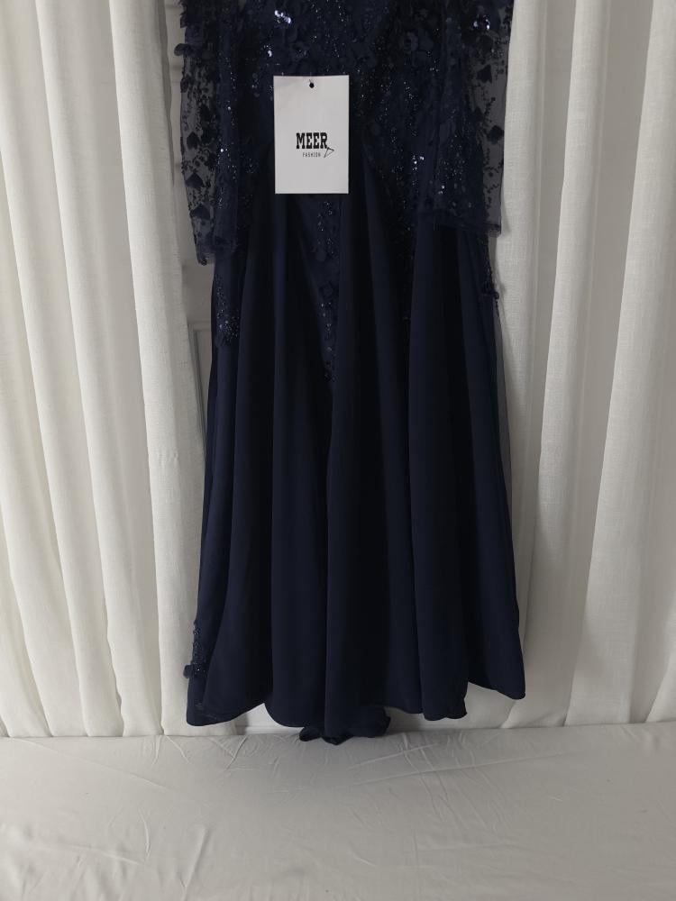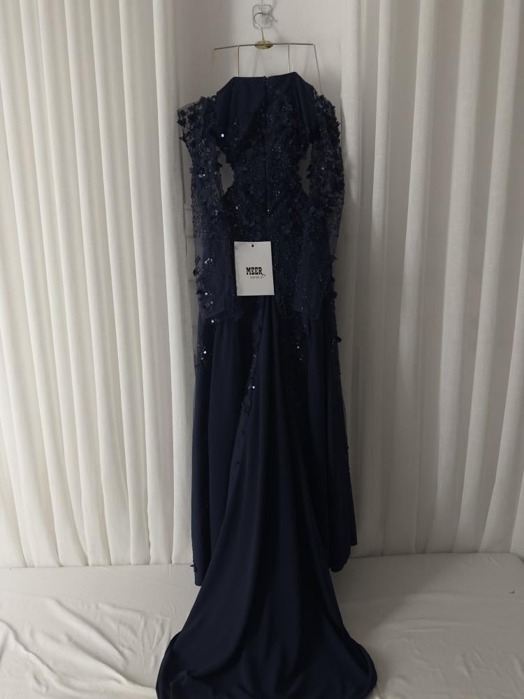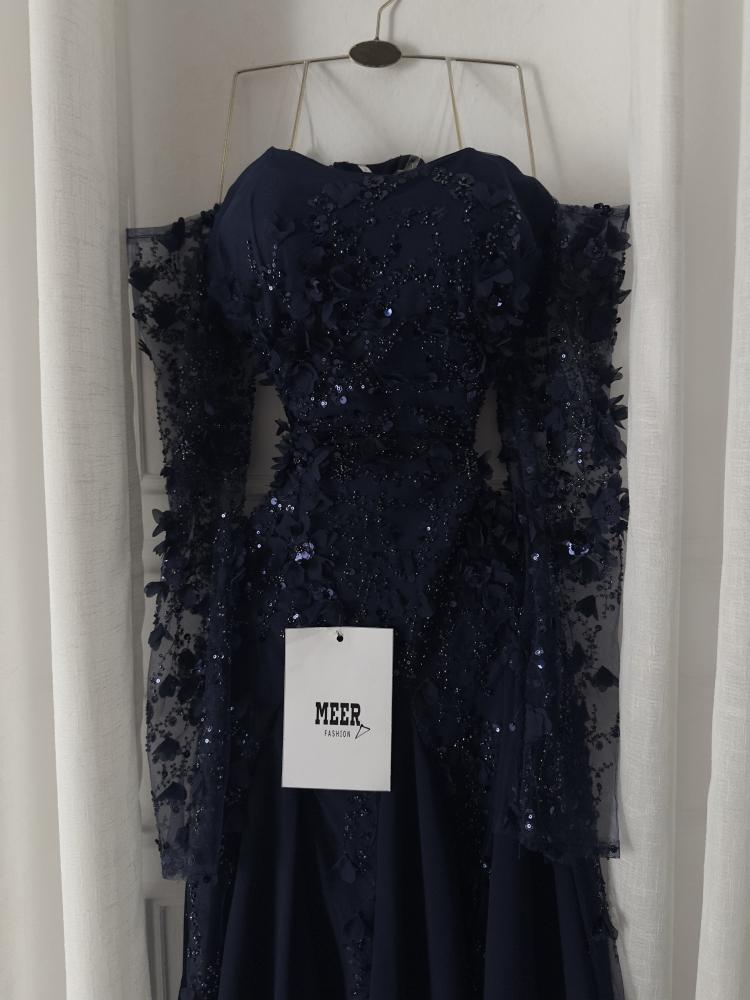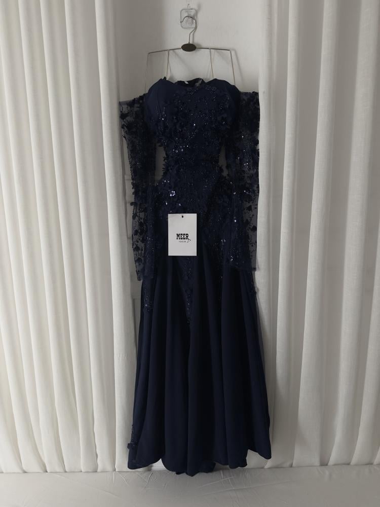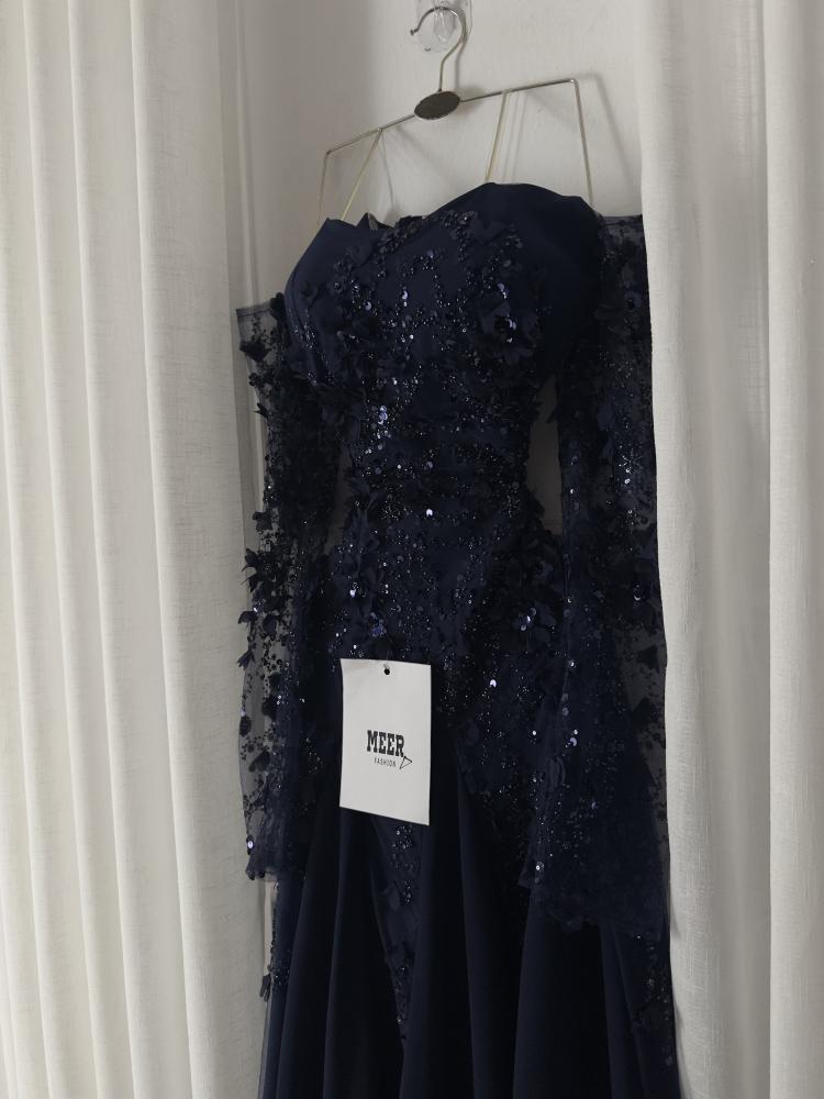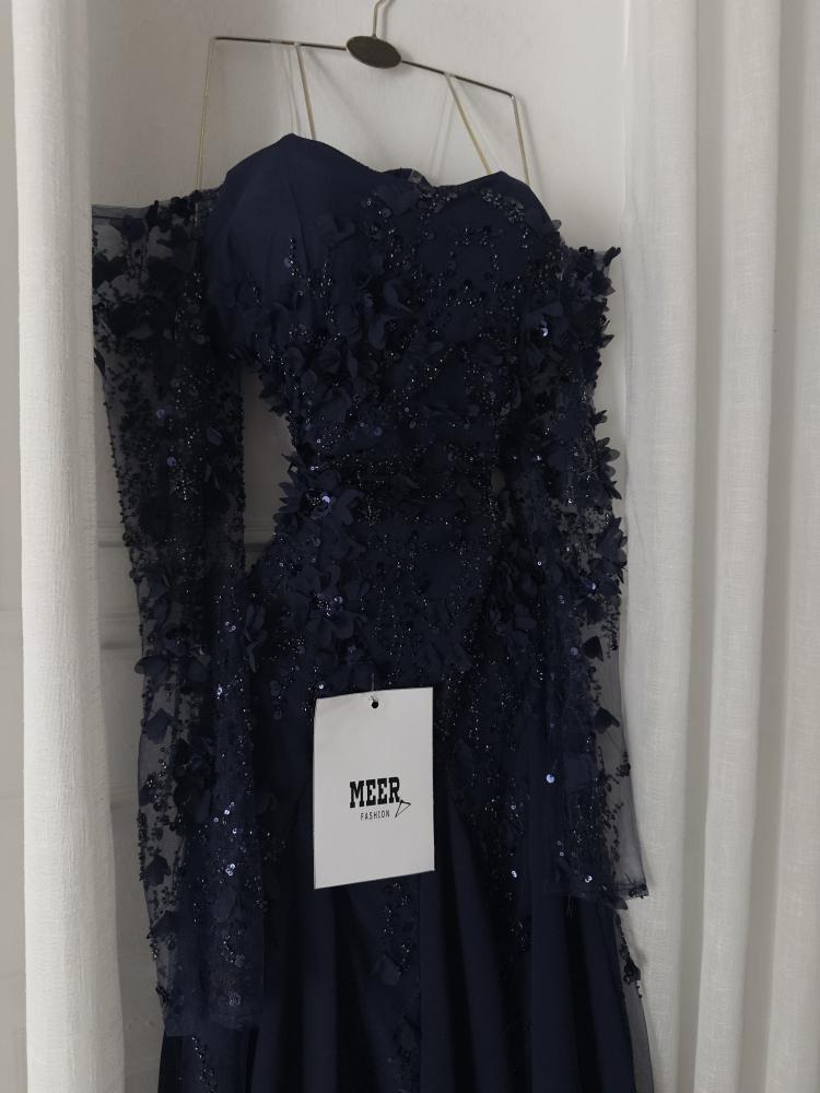 فستان سهرة أنيق بلون كحلي غامق، بتصميم أوف شولدر وأكمام طويلة من الدانتيل المطرز بالخرز والترتر اللامع. الجزء العلوي ضيق يبرز الخصر، والتنورة تنسدل بقَصّة واسعة انسيابية تمنح إطلالة فخمة وجذابة